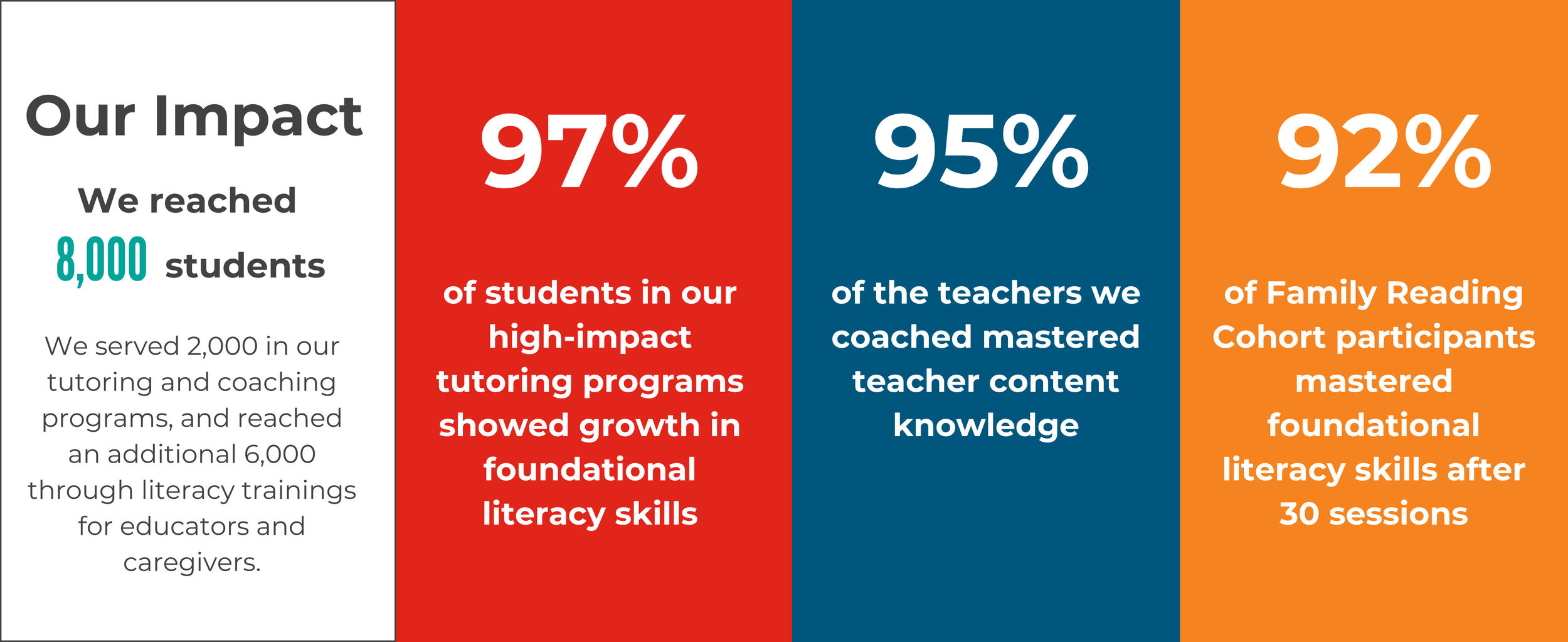 Readers 2 Leaders is spreading the science of reading across North Texas, equipping children and their communities with the skills to unlock a world of opportunities through literacy. In 2024-2025, we served 2,000 students and 393 adults across our tutoring and coaching programs. We scaled our impact and reached an additional 6,000 students through adults trained on the Science of Reading and strategies for student success.